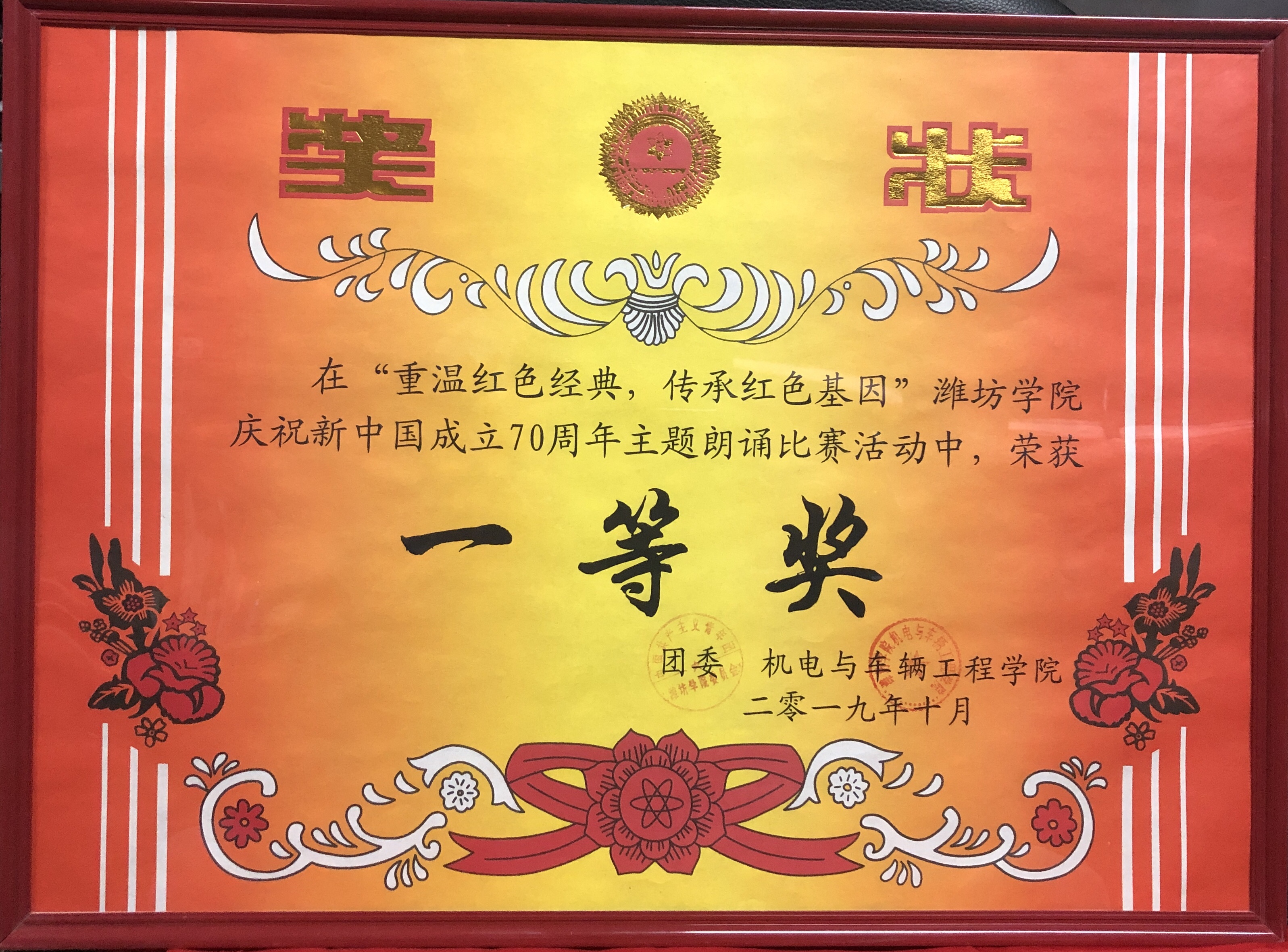 “一字一句诵经典,一言一行承基因。”为重温中国发展历史,营造激情、青春、文明的校园文化氛围,10月31日晚,由校团委主办,机电与车辆工程学院承办的“重温红色经典,传承红色基因”诗歌朗诵比赛在潍坊学院图书馆报告厅隆重举行。全校共有19个二级学院参加比赛。