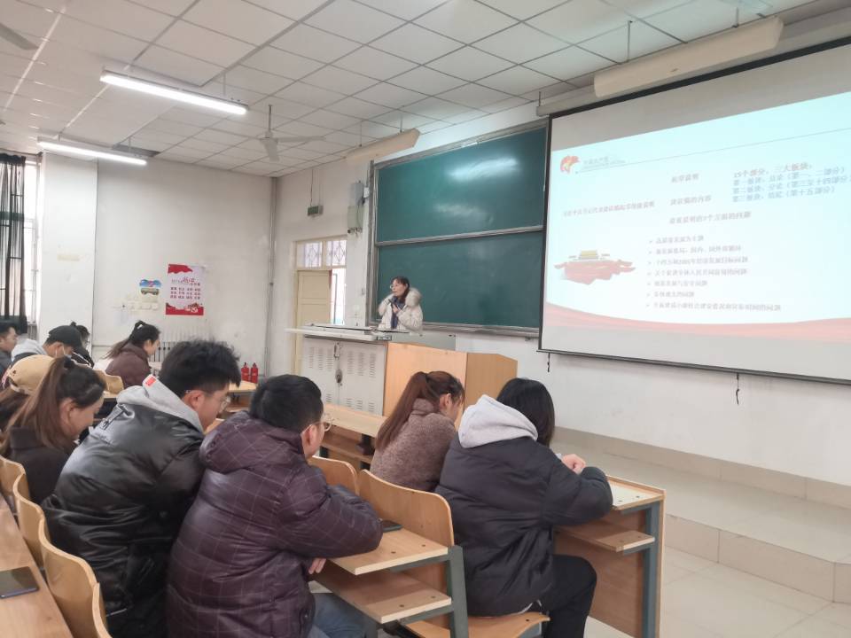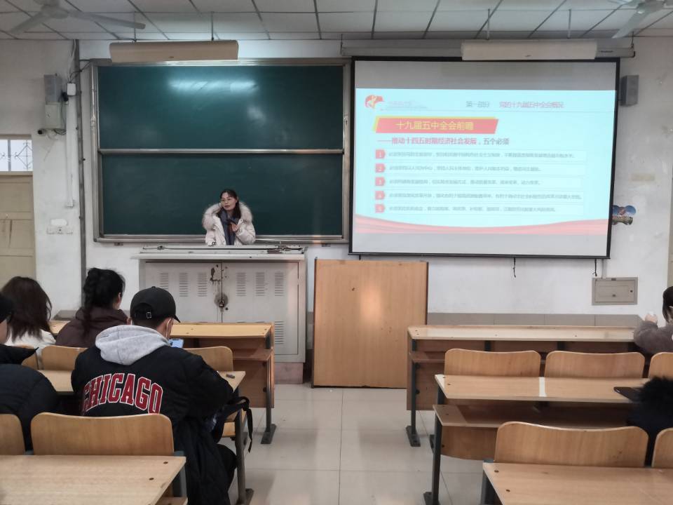 宣讲中,张芳芳老师分别从党的十九届五中全会概况、“十三五”经济社会发展成就、五中全会如何书写大变局下的“中国故事”以及认真学习十九届五中全会精神做新时代的奋斗者这四个方面对党的十九大五中全会精神进行了解读。“中华民族的伟大复兴的中国梦将在一代代青年的接力奋斗中变为现实。”在宣讲中着重强调了习近平总书记对青年一代提出的美好期待,激励广大青年学生在大学学习生活中不仅要重视认知和求知,更要重视内省与修养、行为与实践。无论是在学习还是生活中都要提高境界、提高能力、迎难而上、开拓进取,以超高的政治素养和良好的心态面对成长路上的困难与坎坷,做到脚踏实地,永不厌弃。“只有与历史同步伐、与时代共命运的人,才能赢得光明的未来。”