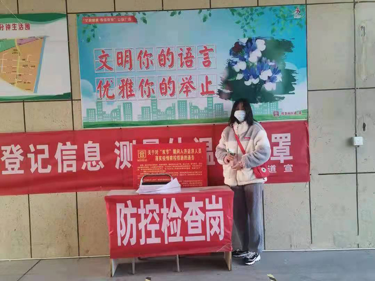 身在山东省东营市东营区黄河口街道办事处的张慧雯同学与威海市文登区的宋意洁同学在通往村庄的路口处进行了外来人员登记、体温测量、发放关于疫情防护的传单、和环卫工人一起对道路进行清扫等一系列工作。
