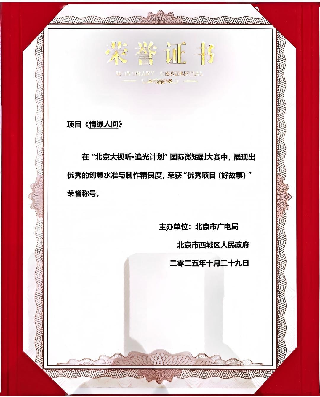 由我院教师马楷博带队创作的精品微短剧剧本《情缘人间》,凭借优秀的创意水准与制作精良度,从千余部作品中脱颖而出,最终荣获“优秀项目(好故事)”荣誉称号。