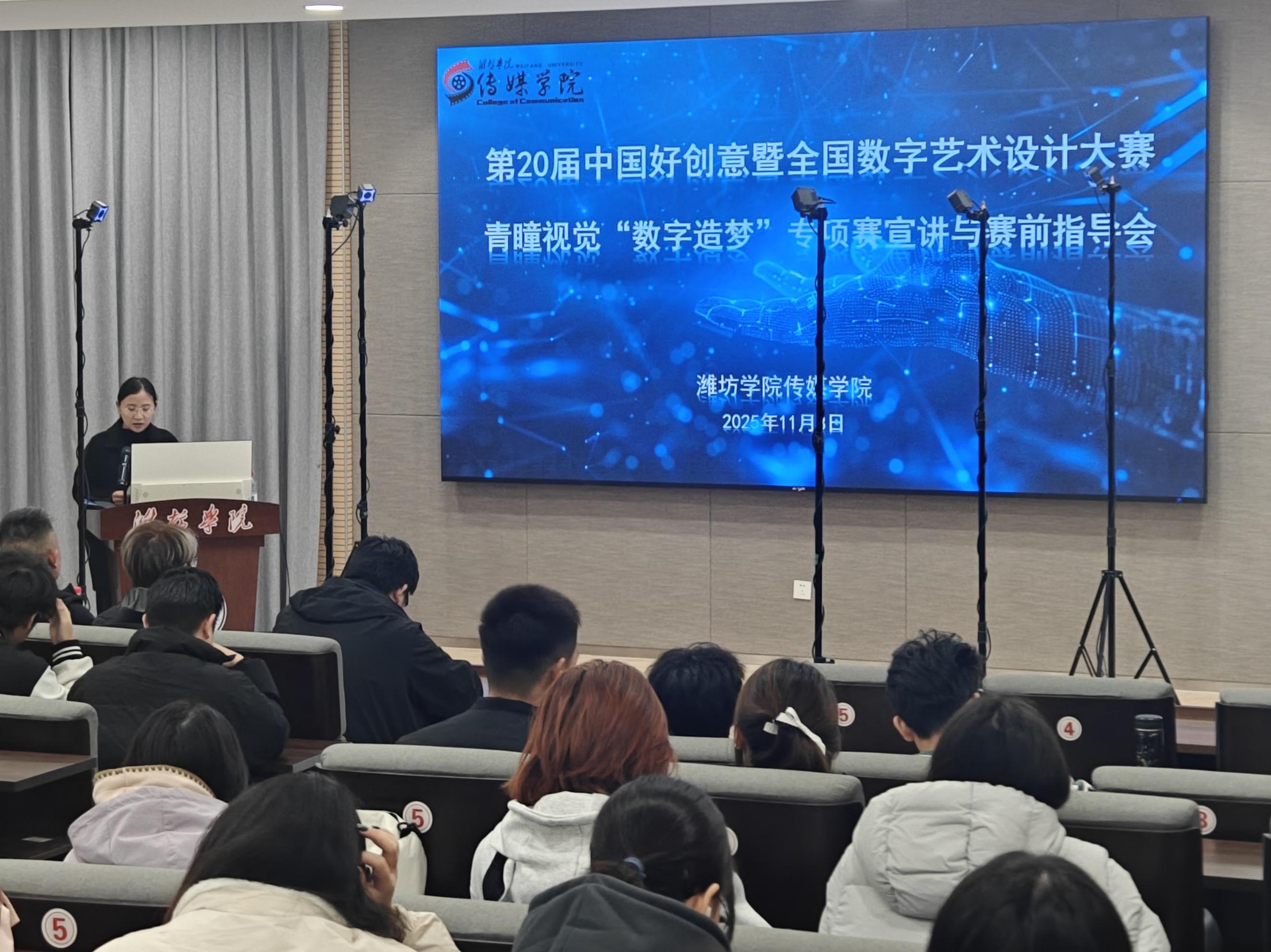 为深化数字创意人才培养,推动产学研深度融合,助力师生精准把握赛事核心要求,11月8日,第 20 届中国好创意暨全国数字艺术设计大赛青瞳视觉 “数字造梦” 专项赛潍坊学院站宣讲与赛前指导会在知新楼4210正式举行,大赛组委会代表和传媒学院各专业学生参加。