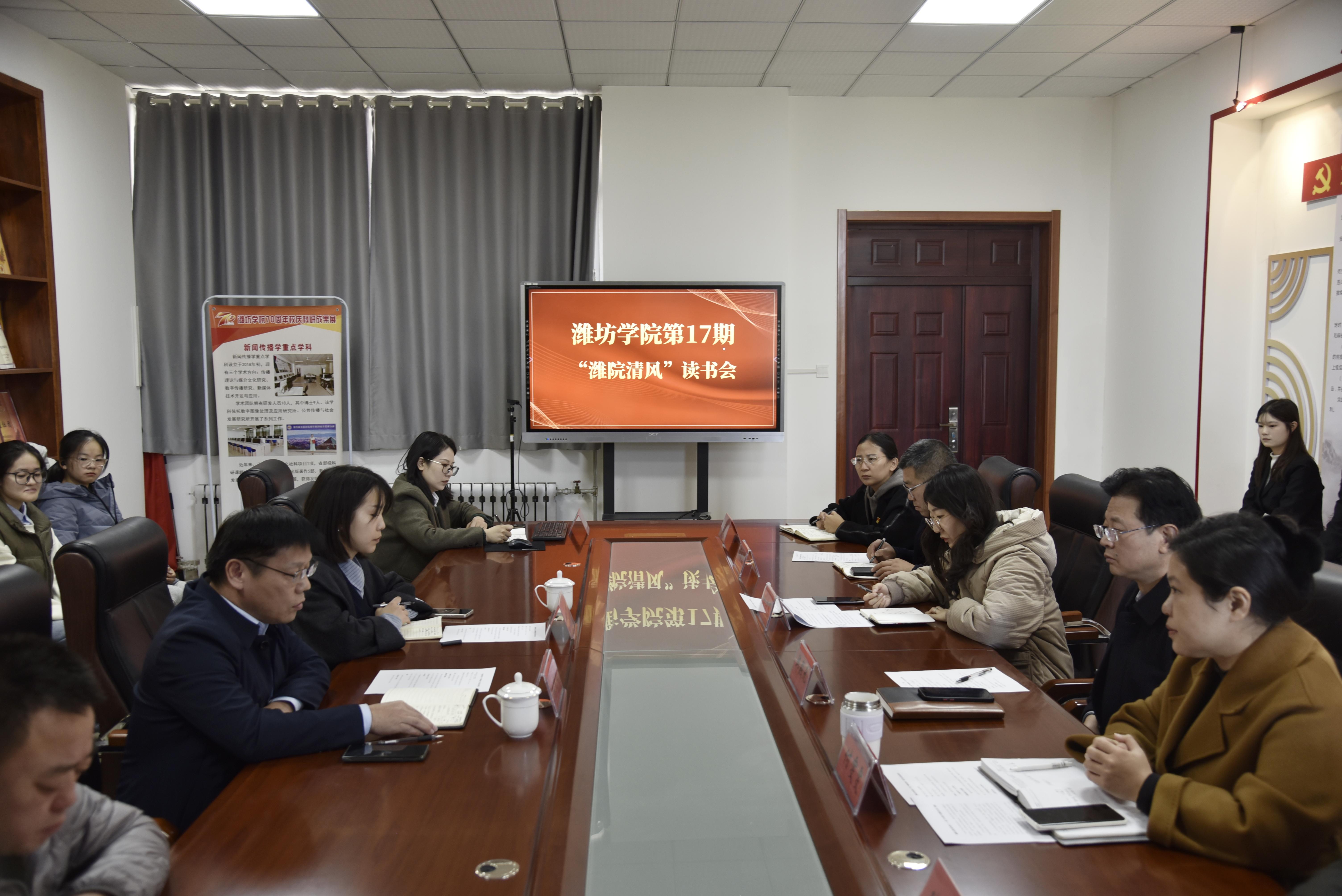 为筑牢师生廉洁思想防线、厚植校园清廉文化根基,11月19日上午,我院在天一楼7404会议室举办“潍院清风”第17期读书会活动。学校纪委副书记张增国出席,传媒学院党委书记张鲁筠主持,传媒学院领导班子成员、全体辅导员、教师代表及学生代表参加本次活动。