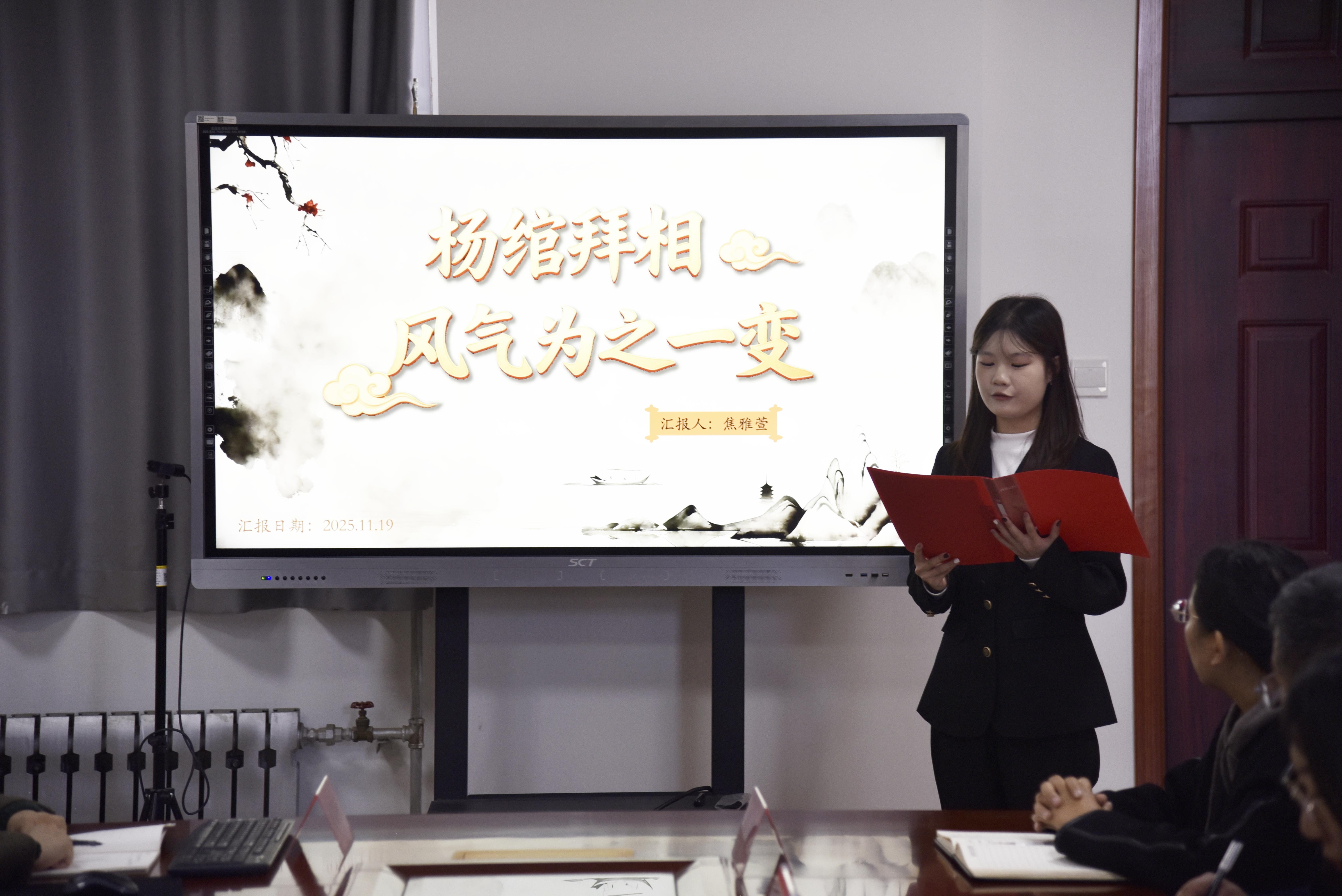学生代表张跃译、田梦雪先后汇报了对廉洁文化的理解与感悟。他们结合校园生活与青年责任,畅谈了新时代大学生应如何树立廉洁意识、践行廉洁准则,表达了在学习生活中坚守底线、拒绝诱惑的坚定决心。随后,师生共同欣赏了《公仪休嗜鱼拒贿》《杨绾拜相》主题朗诵。朗诵者以饱满的情感,生动诠释了公仪休“受大者不得取小”的自律智慧和杨绾崇俭抑奢、整顿吏治的担当精神,让在场师生在经典传承中感受廉洁力量。