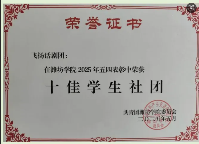 飞扬话剧团荣获潍坊学院“十佳社团”称号https://mp.weixin.qq.com/s/_fcWm5FVcTr7RHIvjrTzfQ