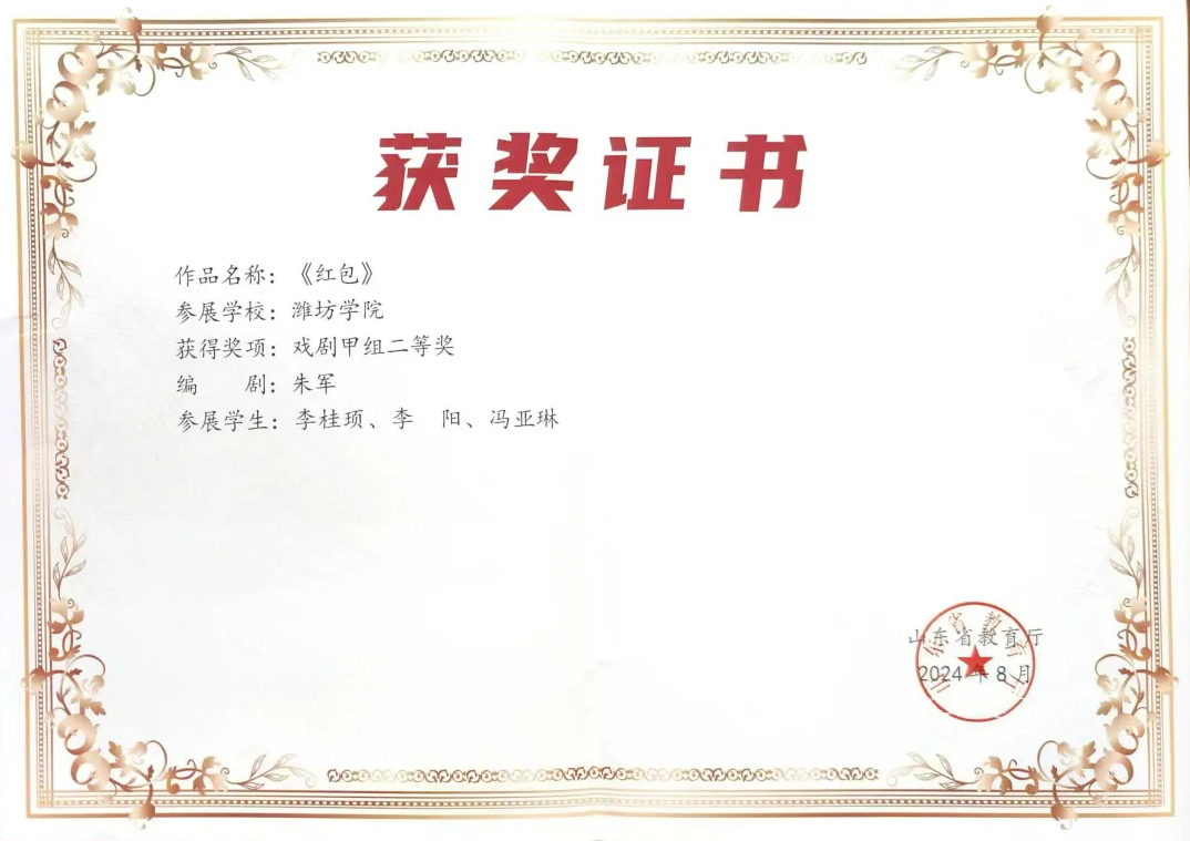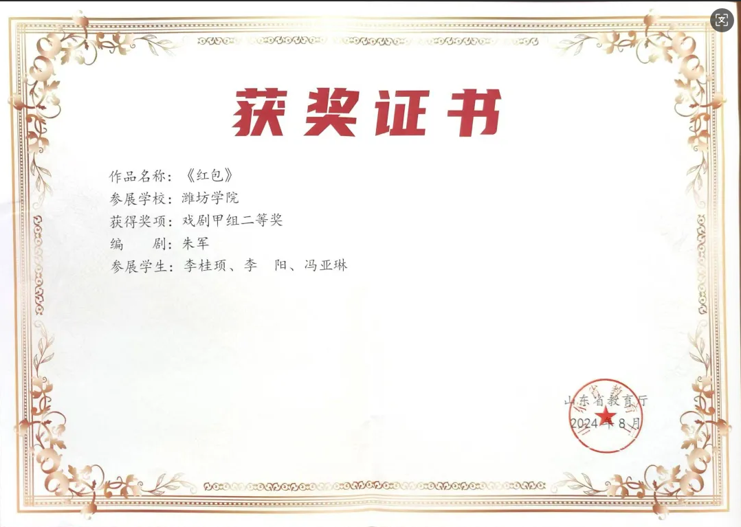 原创话剧《红包》在2024山东省大学生校园艺术节合唱戏剧专项展示活动荣获“优秀原创作品奖(戏剧)”和“优秀表演奖(戏剧)二等奖”https://mp.weixin.qq.com/s/3xmjuFff0FL9JoEeSNBH2w