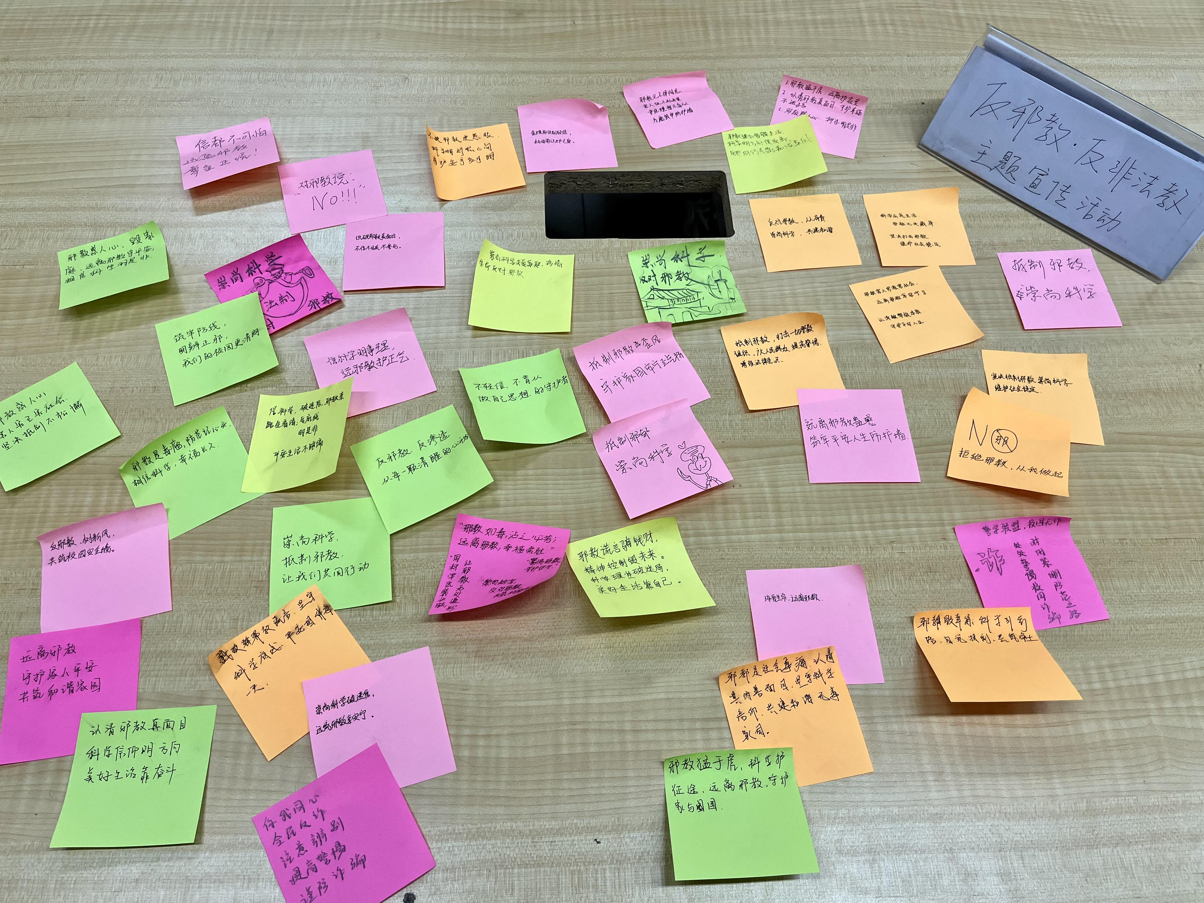 随后,同学们手持便利贴,结合所学知识与自身感悟,认真写下抵制邪教的决心、反邪宣传口号及安全防护小贴士。一张张便利贴,汇聚了同学们对邪教危害的清醒认识,表达了他们坚决与邪教作斗争的态度,以及积极维护校园与社会和谐稳定的责任感。