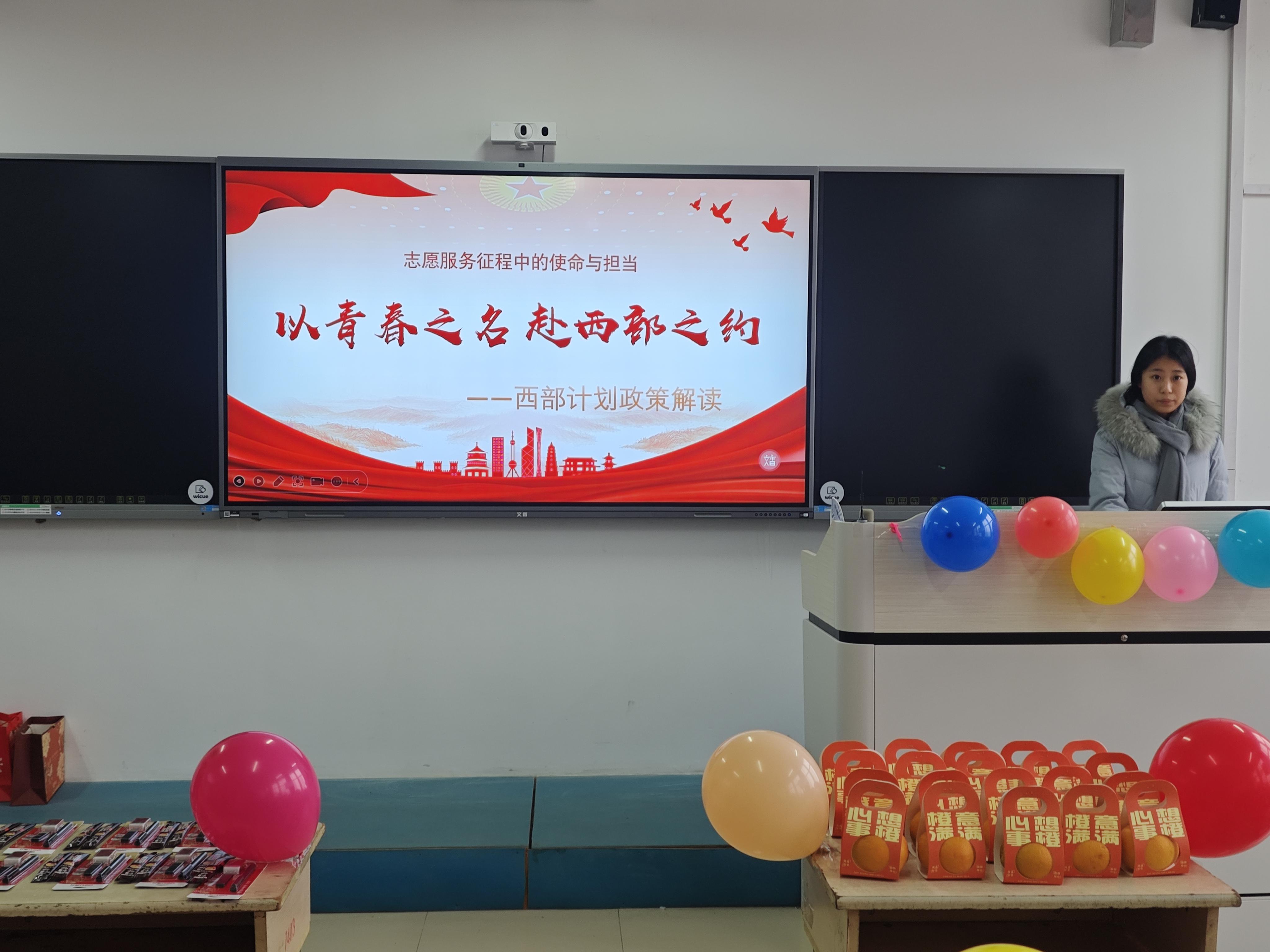 12月12日上午,我院在7414教室顺利举办西部计划专题宣讲活动。本次活动面向我院应届毕业生开展,我院团委副书记兼学生工作办公室副主任张潇出席。