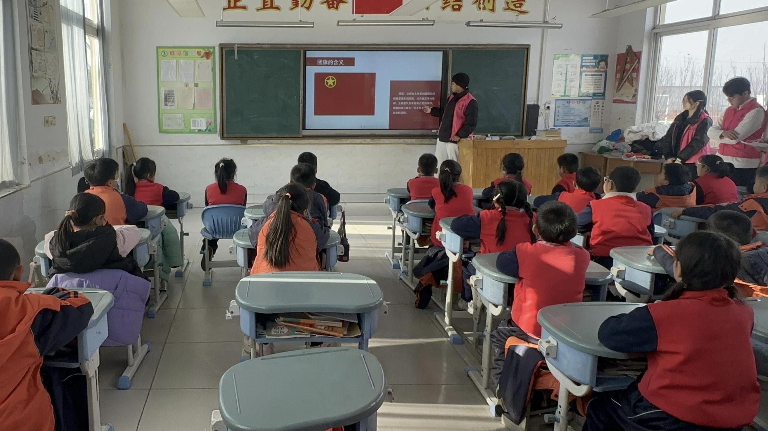 活动现场,志愿者们将教室布置成科普小课堂,通过幻灯片放映展示国旗、团旗、少先队队旗的图文资料,以通俗易懂的语言讲解各类旗帜的设计理念与象征意义。讲解国旗时结合课件解析图案内涵并引导孩子主动思考,讲解团旗和队旗时则用动画短片展示使用场景与礼仪规范,多样化的科普形式充分调动了孩子们的参与热情,让课堂形成热烈的互动氛围,也让孩子们直观地理解了旗帜的文化内涵与使用规范。