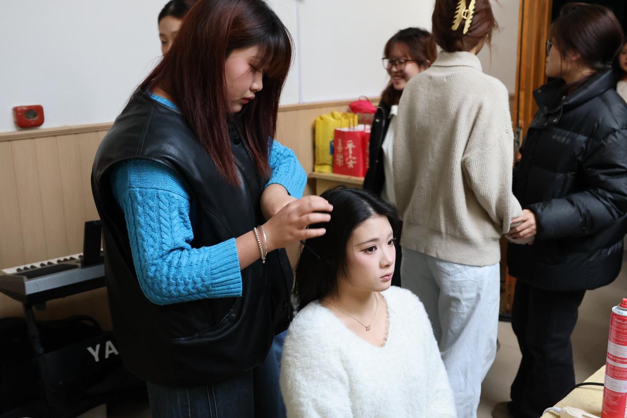 晚会开场前的数小时,妆造间早已是一片忙碌的景象。有人为舞蹈演员勾勒出灵动的眼妆,让舞台上的每一个眼神都更具张力;有人为歌唱选手打造出贴合曲风的发型,从利落的短发造型到飘逸的编发设计,每一处细节都反复调整。对他们而言,让演员以最好的状态站上舞台,就是这份幕后工作最珍贵的意义。