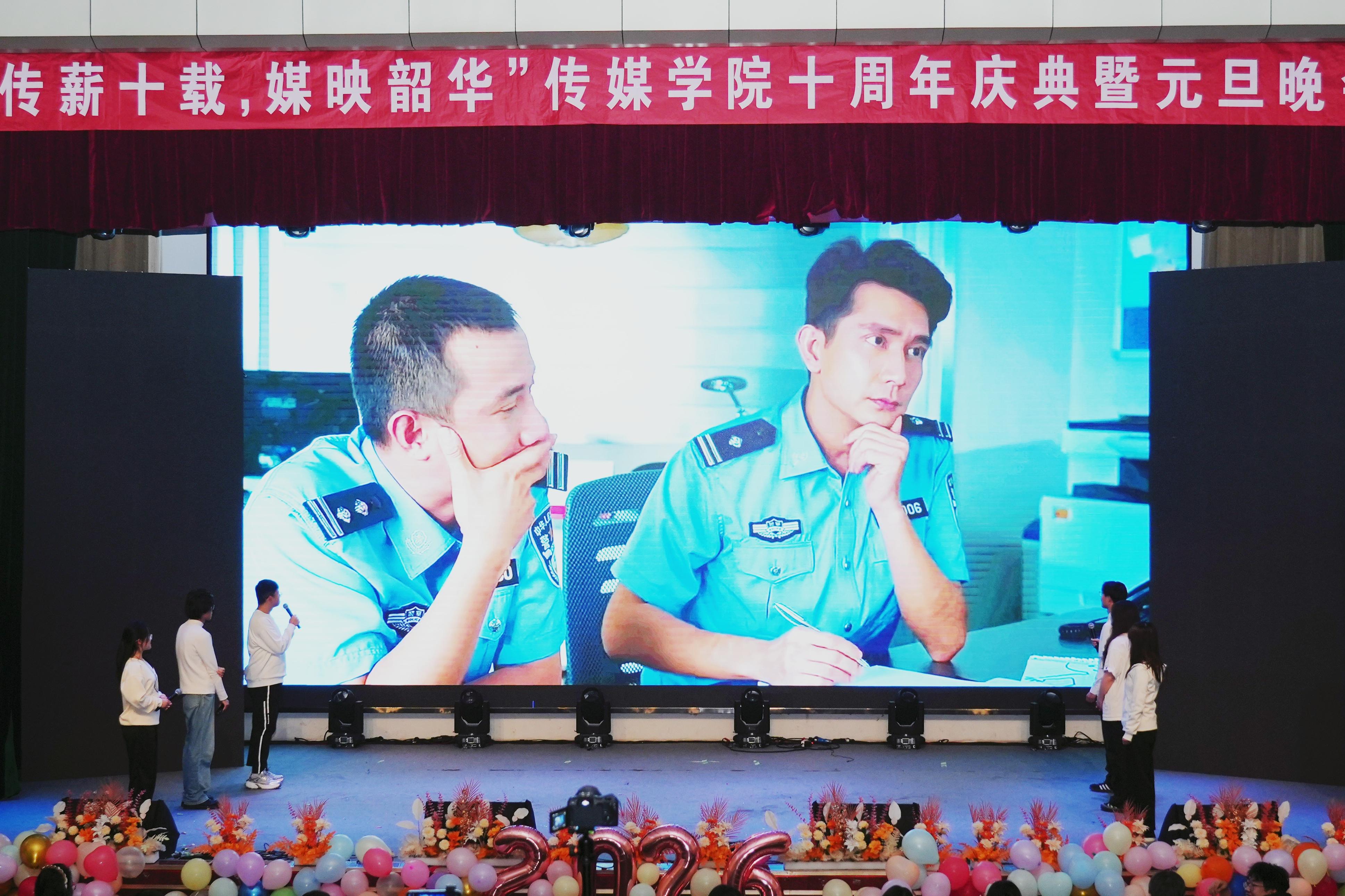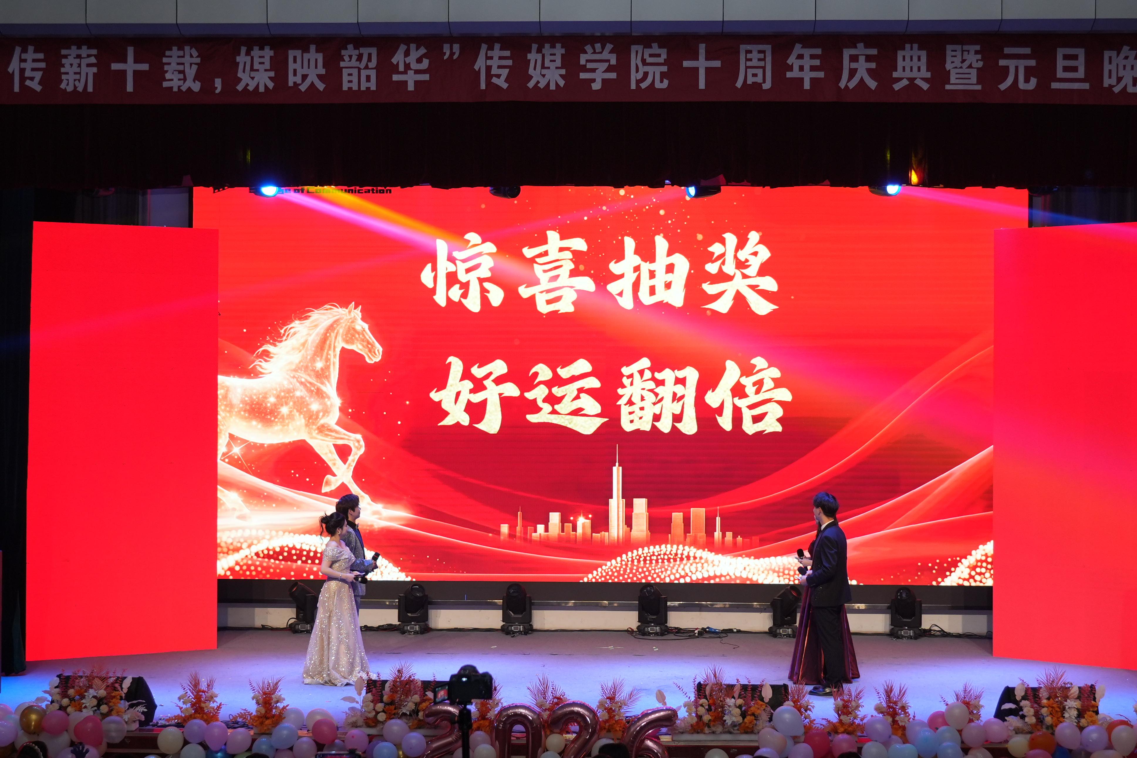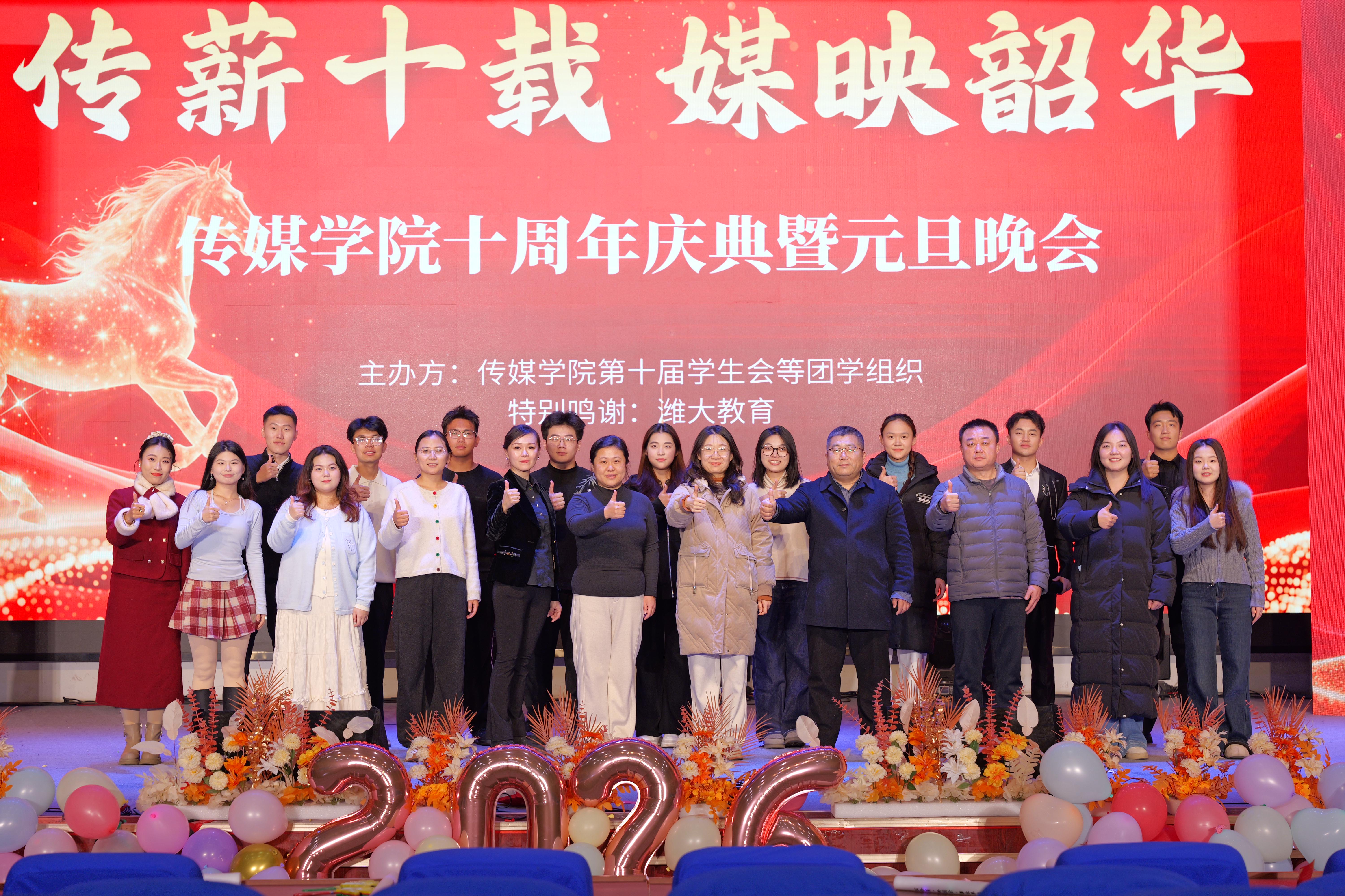 12月28日晚,传媒学院于图书馆报告厅隆重举行“传薪十载,媒映韶华”传媒学院十周年庆典暨2026年元旦晚会。学校党委委员、副校长任立春,传媒学院党委书记张鲁筠,党委副书记、副院长邓建波,副院长付雯雯等领导老师莅临现场,与全院师生共襄盛举,喜迎新春。