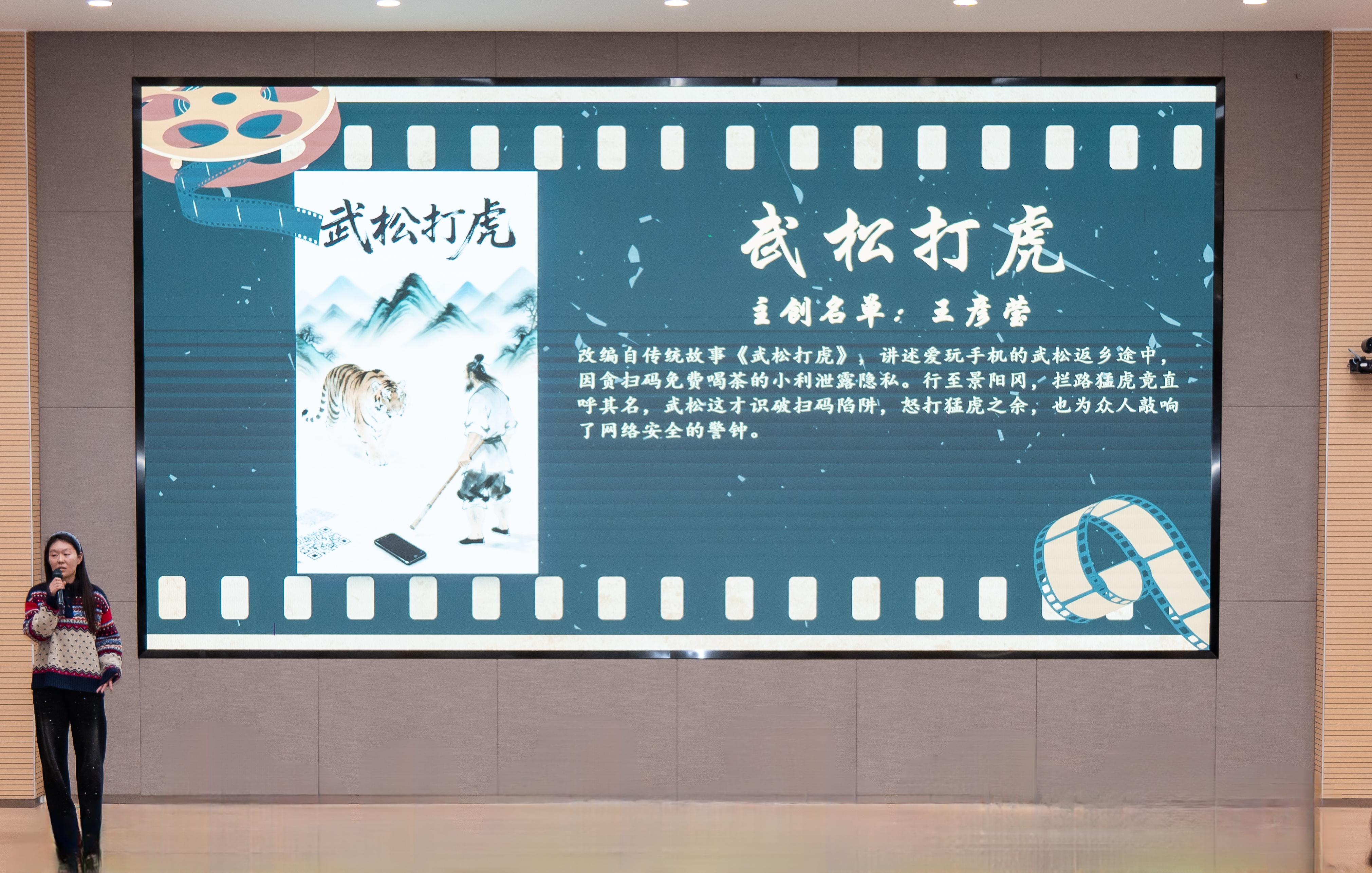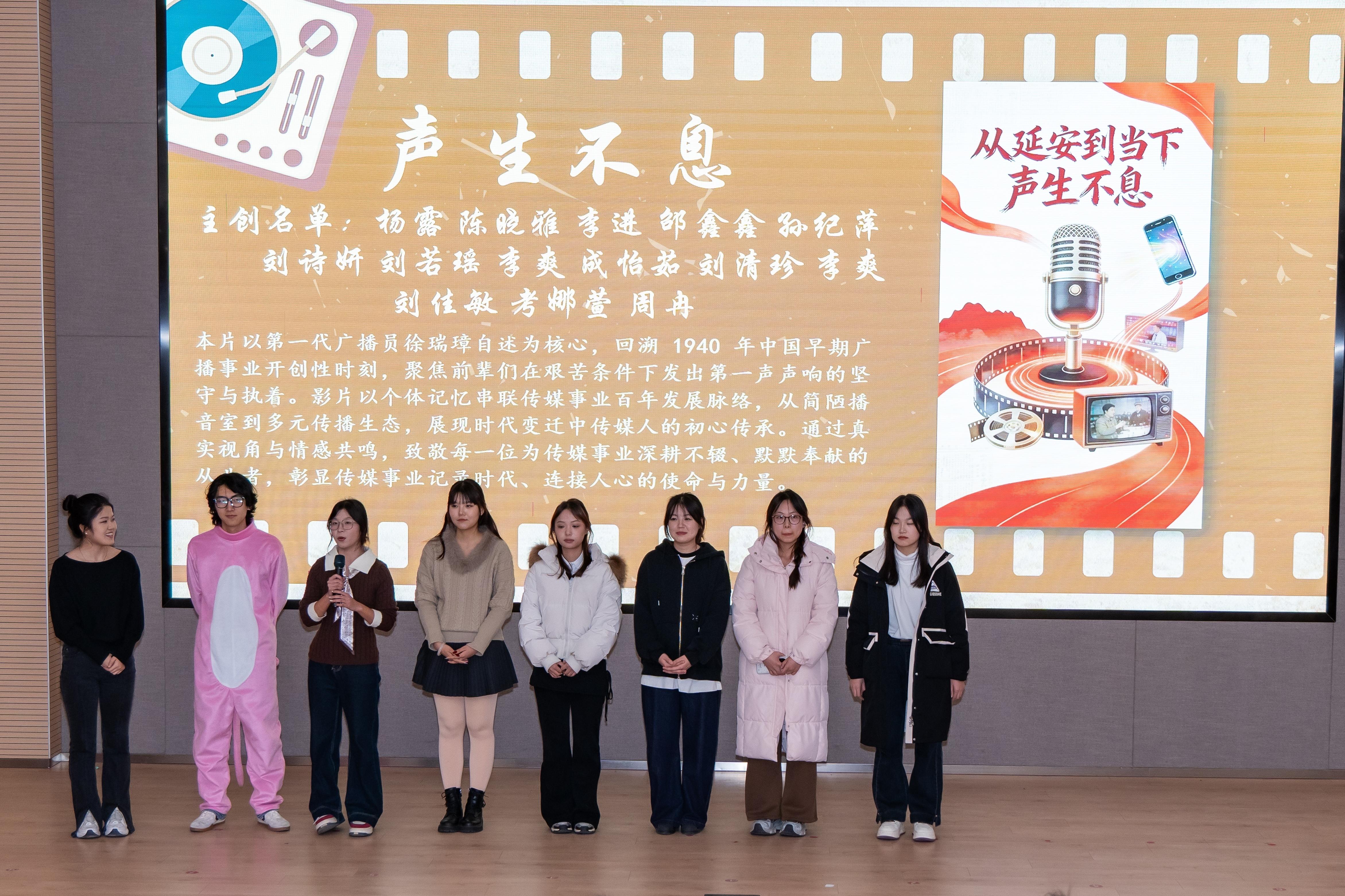 随后进入作品展映环节。本次展映涵盖红色文化、微电影、AIGC创新短片及纪录片四大板块,共呈现《星火长明》《声生不息》《针程》《花儿》《一针一线,一犬一生》等十一部学生原创作品。这些作品均源自实验班劳动教育课程实践项目,是同学们将理论知识转化为创作实践的鲜活成果。影片放映结束后,主创团队依次上台分享创作思路与拍摄心得,结合实践项目开展过程中的难点与收获展开深入交流,现场氛围热烈浓厚。