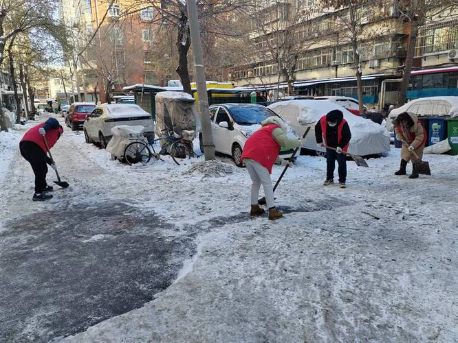 在社区统一调度下,志愿者们分组行动,全面投入清雪工作。大家手持铁锹、推雪板等工具,重点对社区主干道、人行步道和单元门前等区域进行积雪清理。面对低温天气,队员们干劲十足,协作默契,确保积雪随清随运,最大限度减少对居民出行的影响。同时,部分队员在坡道、出入口等关键点位撒布融雪剂,加速冰雪消融,切实保障通行安全。