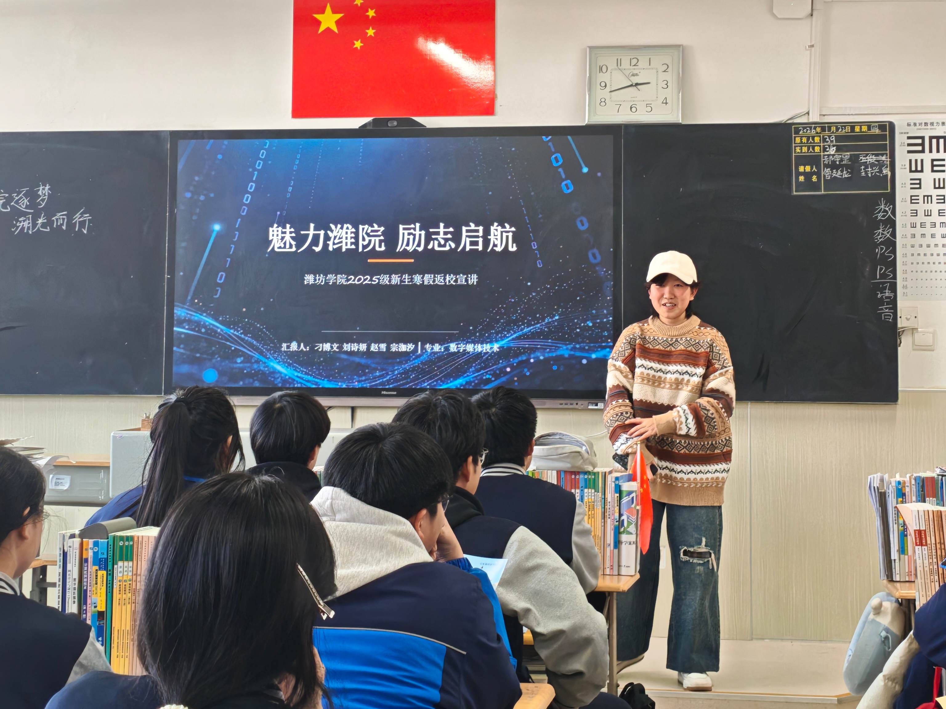 为搭建高校与生源高中的沟通桥梁,全方位展现我院的办学魅力与育人特色,1月22日下午,我院2025级数字媒体技术专业34对接班的刁博文、赵雪、宗泇汐三名同学组成宣讲小组,走进青岛西海岸新区职业中等专业学校,举办以“魅力潍院 励志启航”为主题的大学宣讲活动。