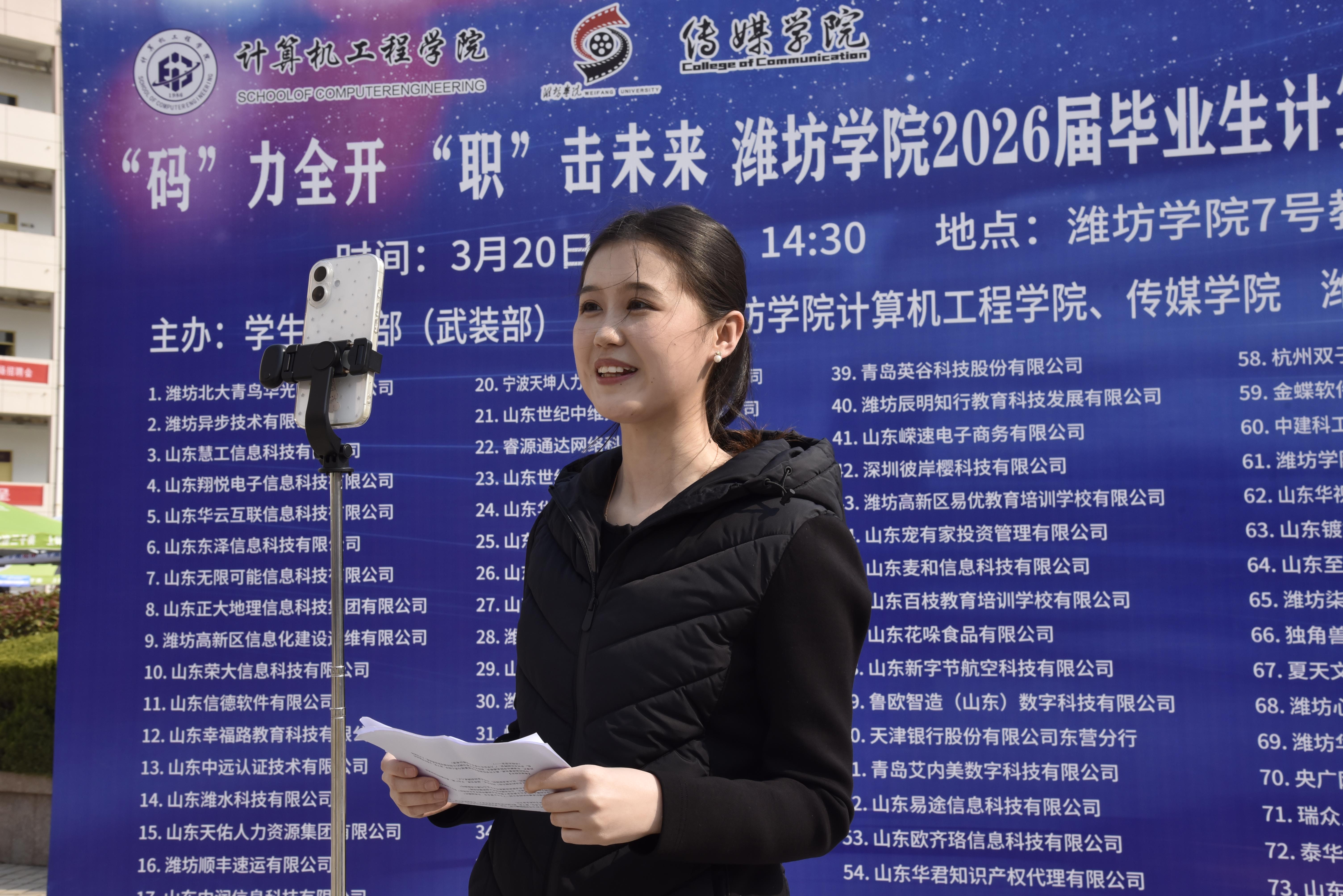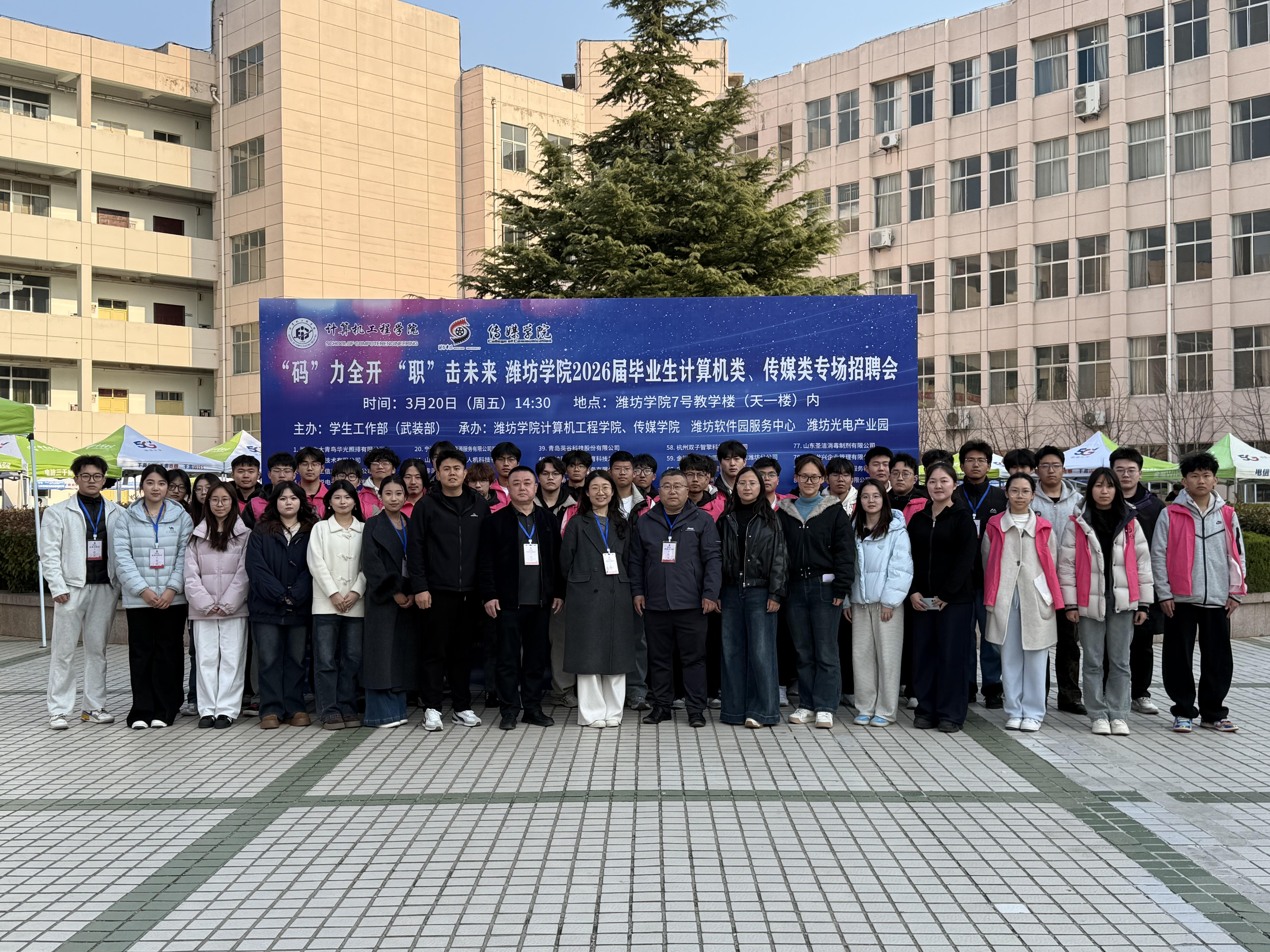 为切实做好毕业生就业服务工作,搭建用人单位与毕业生双向选择平台,促进人才精准对接与高质量就业,3月20日下午,潍坊学院2026届计算机类、传媒类专场招聘会在天一楼院成功举办。学校党委委员、副校长任立春、学生工作部、计算机工程学院及传媒学院相关负责同志参加并现场指导。