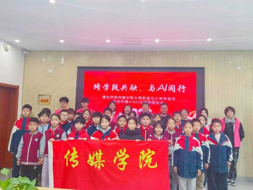 为推动志愿服务与专业实践深度融合,助力大中小学生思政课一体化建设,近日,我学院依托“大手拉小手”志愿品牌,联合潍坊高新金马公学启动AIGC项目跨学段支持计划。该计划由高新区教育局牵头,自3月17日启动以来,传媒学院动画教研室主任庄艳杰已带领学员三次走进金马公学,开展AI科普与实践指导,以前沿科技赋能青少年成长。