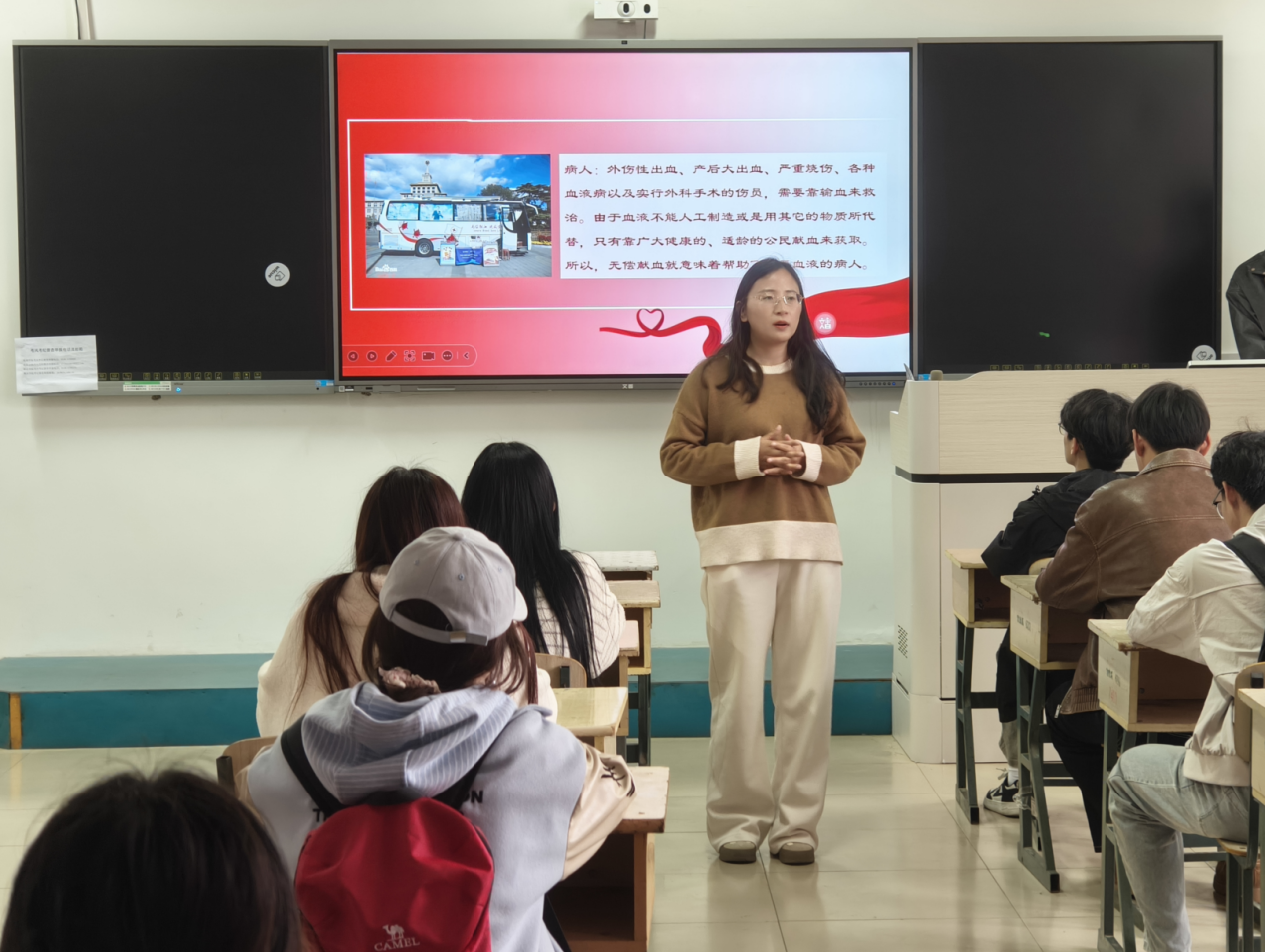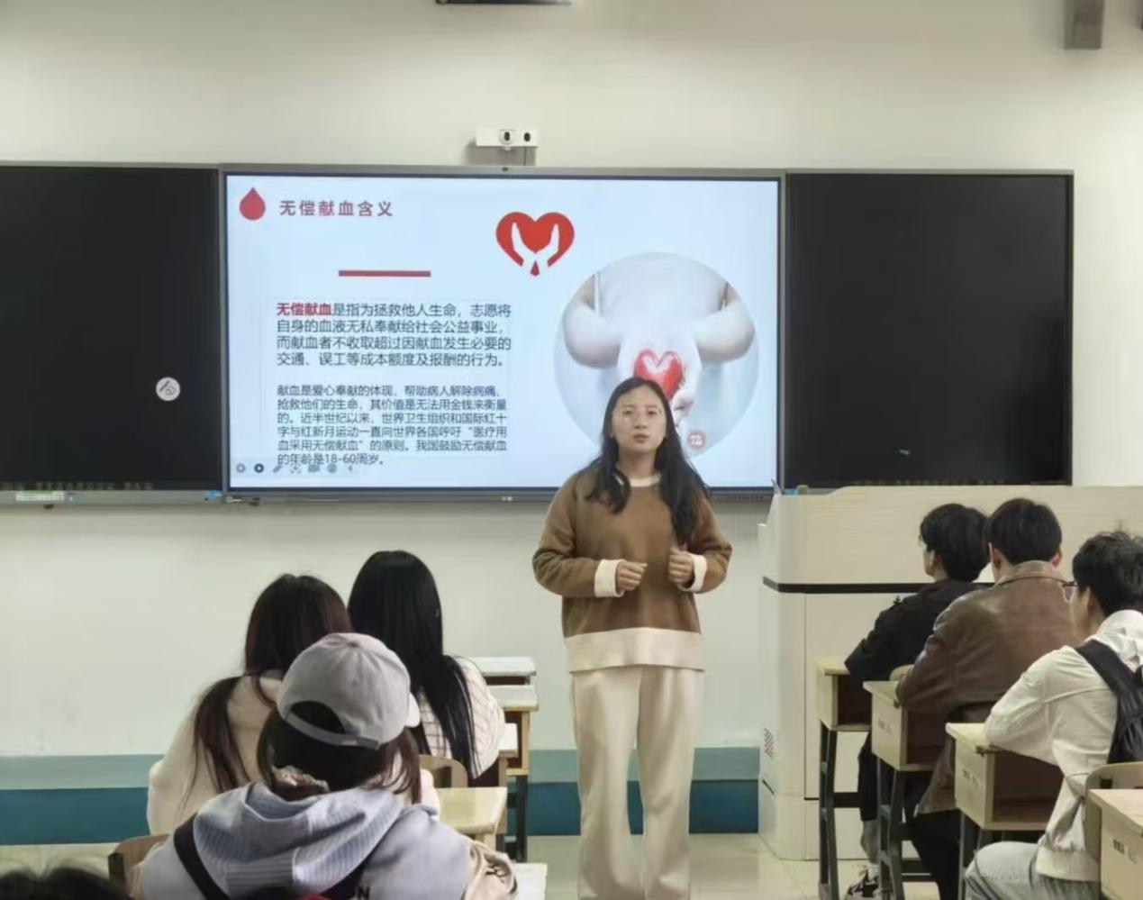 宣讲会现场,张潇首先开展专题宣讲引导,她强调无偿献血是青年践行责任、传递善意的公益之举,倡导大家破除献血谣言、恪守流程规范、主动投身爱心志愿。随后,她通过幻灯片展示、视频播放和真实案例分享,详细讲解了无偿献血的意义、献血条件、流程及注意事项,并针对“献血是否安全”“献血后如何恢复”等常见疑问进行科学解答,有效缓解了同学们对献血的顾虑。互动环节中,同学们踊跃提问,现场气氛热烈,不少同学表示,通过此次宣讲,他们更加深刻地认识到献血对救助生命的重要性,纷纷表示愿意加入无偿献血的行列中来。