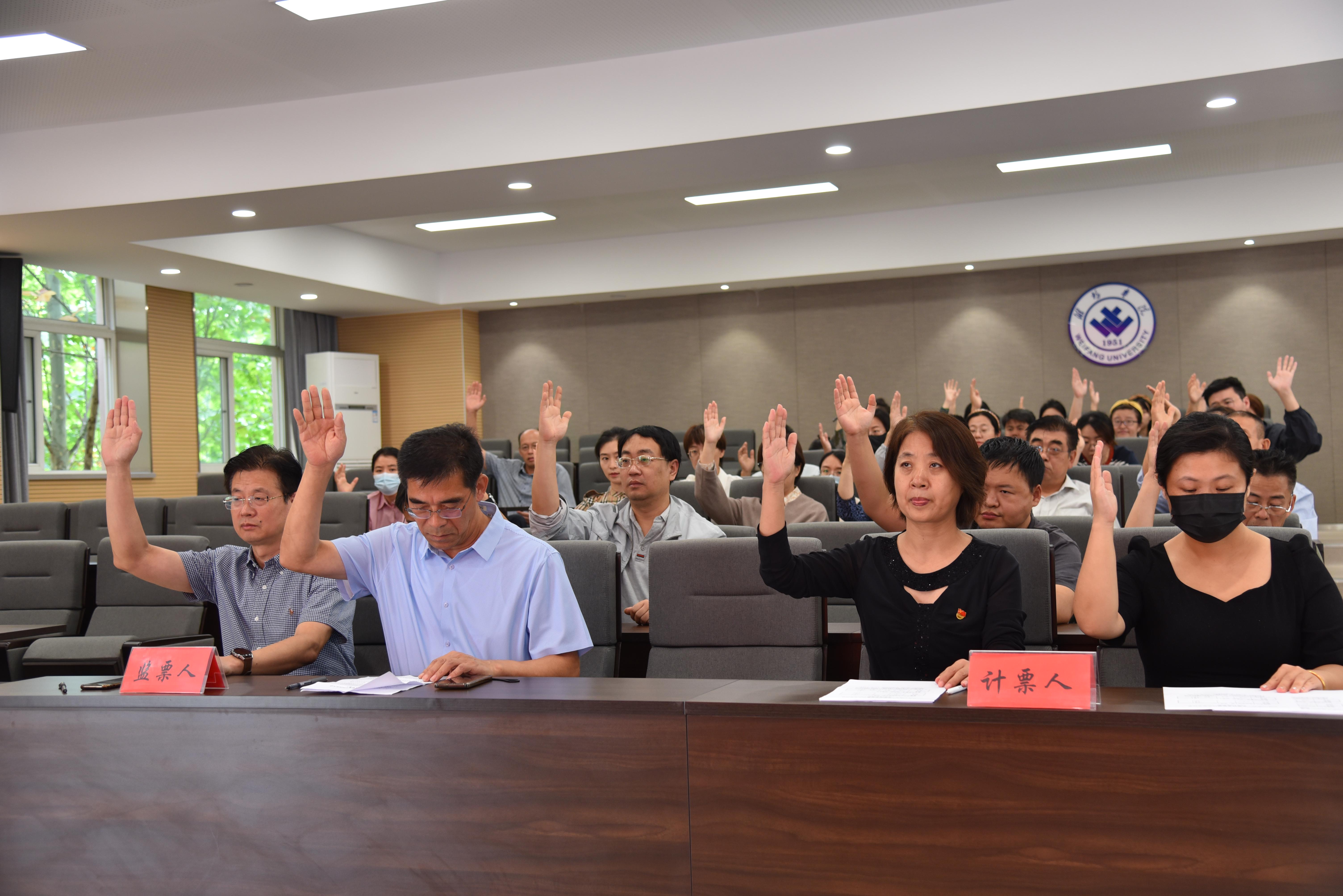 全体党员表决通过了《中国共产党潍坊学院党员大会选举办法(草案)》和监票人名单。通过差额选举的办法,全体党员以无记名投票方式,选举卢运山、刘蕊、董辉3名同志为学校第四次党员代表大会代表。