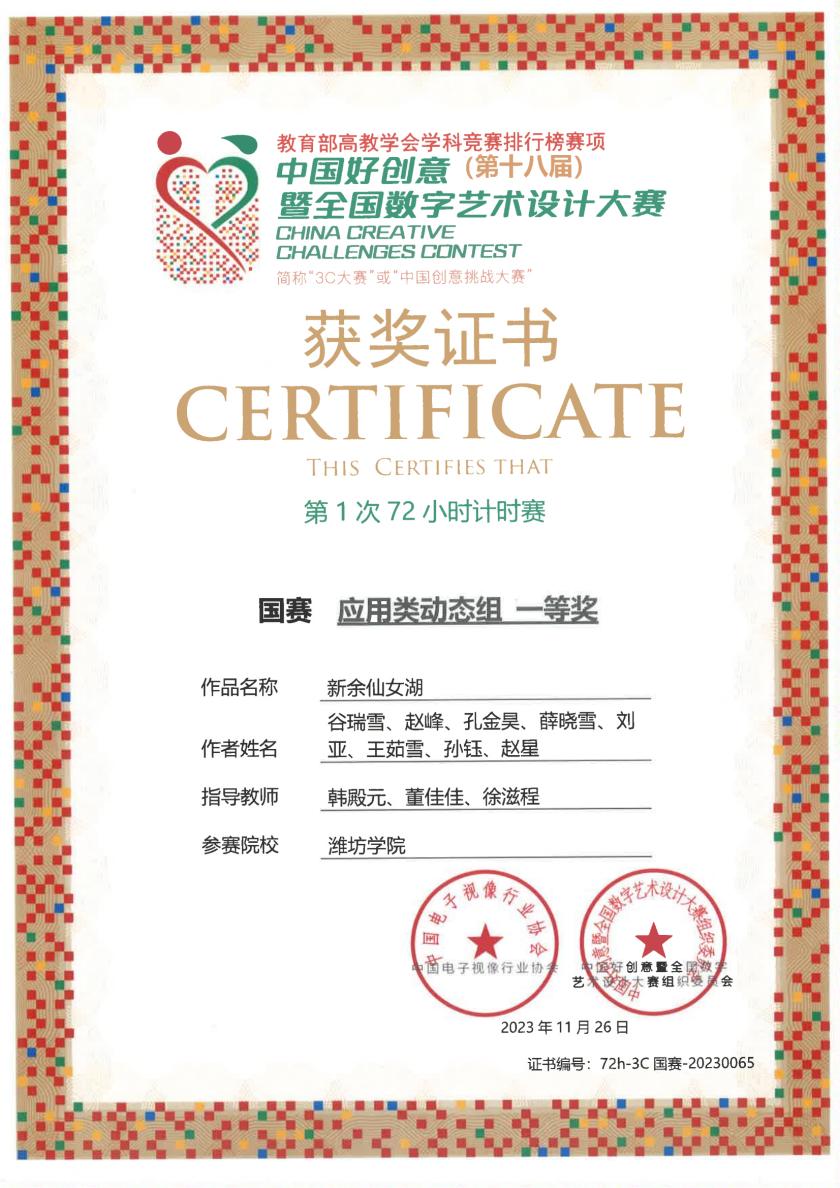 由韩殿元、董佳佳、徐滋程三位老师带队指导的谷瑞雪、赵峰、孔金昊、薛晓雪、刘亚、王茹雪、孙钰、赵星组成的学生团队参赛,凭借出色的创意和精湛的技术,在规定的时间内创作的数字人文旅解说动画视频作品《新余仙女湖》荣获应用类动态组一等奖,《仙女湖景区形象标识手册》荣获探索类静态组三等奖。