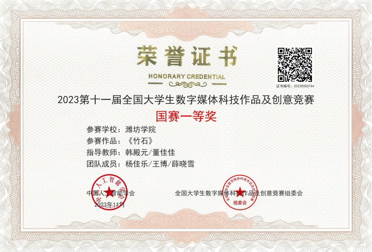 同日,第11届全国大学生数字媒体科技作品及创意竞赛国赛在常州落下帷幕。本次比赛共有来自全国507所高校的8361名选手参赛,也是一场备受瞩目的高水平竞赛。在韩殿元、董佳佳老师的指导下传媒学院动画专业学子杨佳乐、薛晓雪、王博主创的作品水墨动画《竹石》在山东省赛中荣获省赛一等奖并成功晋级,在国赛中再获佳绩,荣获国赛一等奖,此次比赛中展现了传媒学院学子的实力和水平。