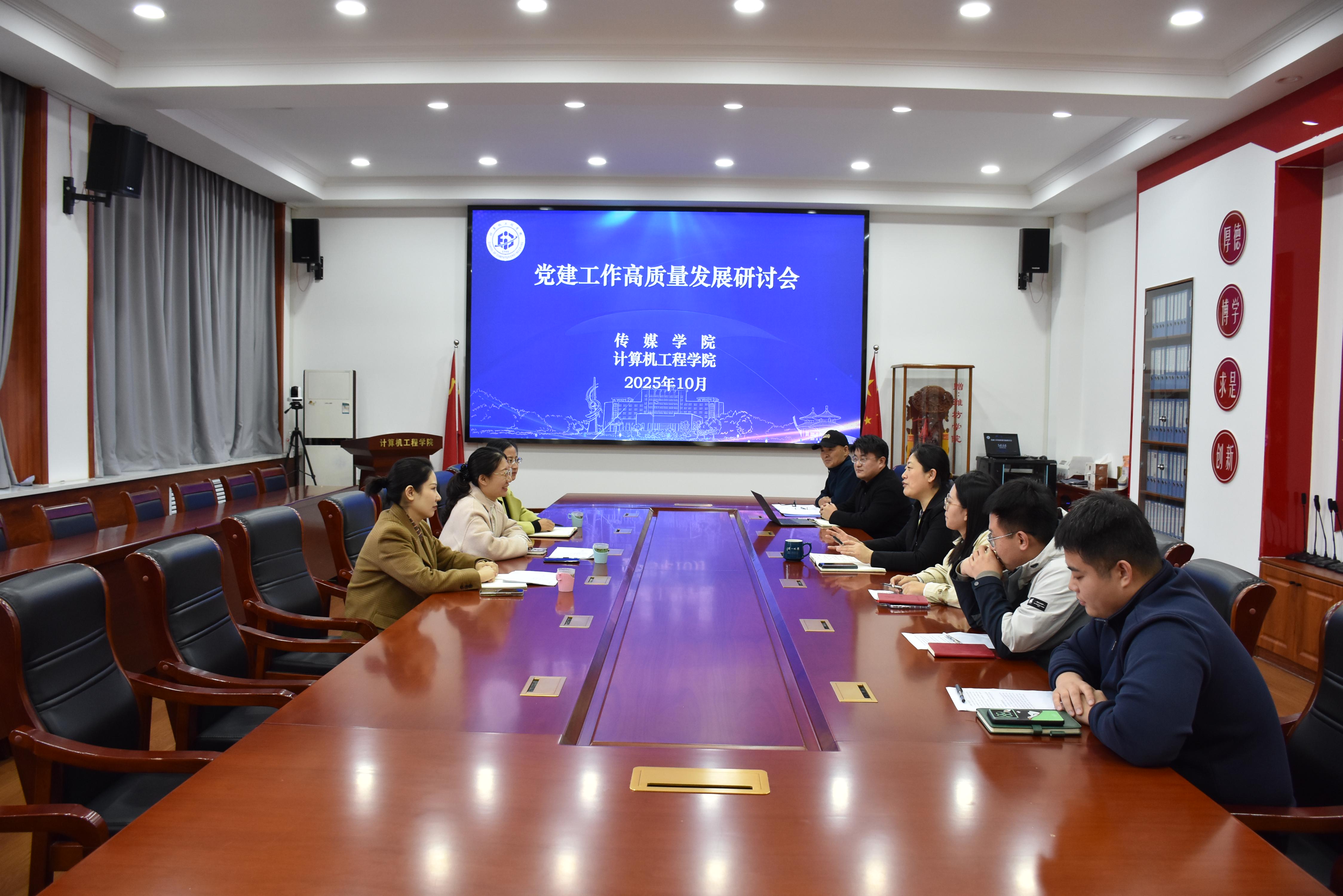 为加强学院间党建工作的交流与合作,促进党建工作创新发展,以高质量党建引领学院高质量发展,10月21日下午,我院与计算机工程学院在天一楼7222会议室召开党建工作高质量发展研讨会。计算机工程学院党委书记任秀洁及党建相关负责人参加,传媒学院党委书记张鲁筠、书记助理李云梓、团委副书记兼学生工作办公室副主任张潇参与会议。